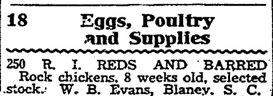 Today in HistoryEggs, Poultry and Supplies 250 R. I. REDS AND BARRED Rock chickens, 8 weeks old, selected stock. W. B. Evans, Blaney, S. C. March 1, 1936 State (published as The State) Columbia, South CarolinaPage 36