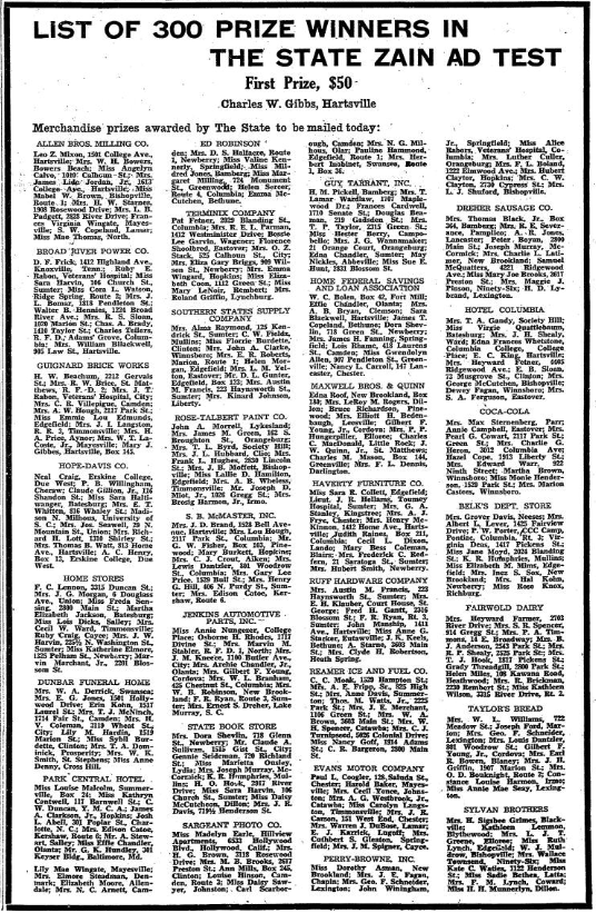 Mrs. Dora Shevlin, 718 Glenn St., Newberry; Mr. Claude A. Sullivan, 1515 Gist St., City; Gennie Seideman, 720 Richland St.; Miss Marietta Ousley, Lydia; Mrs. Joseph Murray, McCormick; K. R. Humphries, Mullins; H. O. Hosk, 2917 River Drive; Miss Sara Harvin, 106 Church St. Sumter; Miss Daisy McCutcheon, Dillon; Mrs. J. R. Davis, 719 1/2 Henderson St.