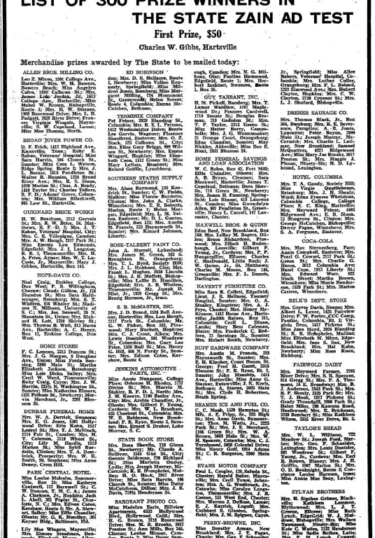 Mrs. Dora Shevlin, 718 Glenn St., Newberry; Mr. Claude A. Sullivan, 1515 Gist St., City; Gennie Seideman, 720 Richland St.; Miss Marietta Ousley, Lydia; Mrs. Joseph Murray, McCormick; K. R. Humphries, Mullins; H. O. Hosk, 2917 River Drive; Miss Sara Harvin, 106 Church St. Sumter; Miss Daisy McCutcheon, Dillon; Mrs. J. R. Davis, 719 1/2 Henderson St.