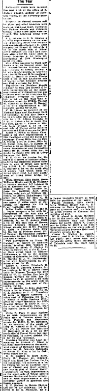 G. G. Moseley to John Anderson Wells a lot in Forest Hills for $5. C. J. Mitchell to L. C. Truesdale 38 acres in Center township, 12 miles east of Columbia, for $5. S. T. Marsh to Sallie Sessions 120.25 acres in Upper township for $650. Douglas McKay to Marie H. Griffin a lot in Kilbourne Park, near the eastern limits of Columbia, for $3.