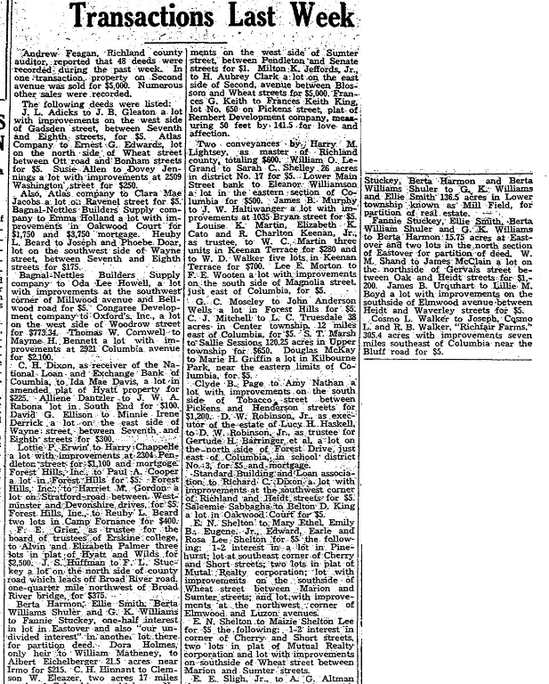 Berta Harmon, Ellie Smith, Berta Williams Shuler and C. K. Williams to Fannie Stuckey 1-2 interest in lot in Eastover and also “our undivided interest” in another lot there for partition deed. Dora Holmes, only heir of William Matheney, to Albert Eichelberger 21.5 acres near Irmo for $215. C. H. Hinnant to Clemson W. Eleazer two acres 17 miles North of Columbia, on highway No. 215 in Upper township, for $40.