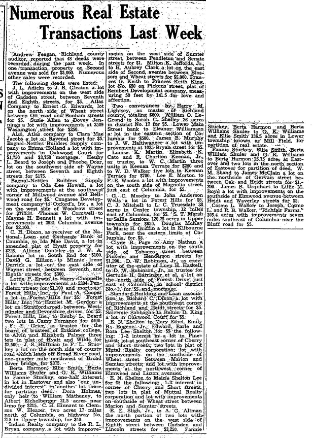 G. C. Moseley to John Anderson Wells a lot in Forest Hills for $5. C. J. Mitchell to L. C. Truesdale 38 acres in Center township, 12 miles east of Columbia, for $5. S. T. Marsh to Sallie Sessions 120.25 acres in Upper township for $650. Douglas McKay to Marie H. Griffin a lot in Kilbourne Park, near the eastern limits of Columbia, for $3.