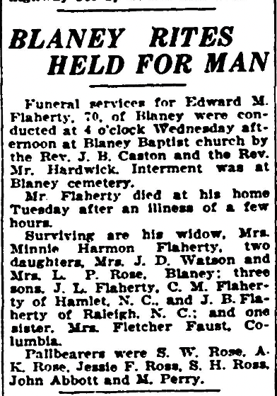 Funeral service for Edward M. Flaherty, 70, of Blaney were conducted at 4 o’clock Wednesday afternoon at Blaney Baptist church by the Rev. J. B. Caston and the Rev. Mr. Hardwick. Interment was at Blaney cemetery.