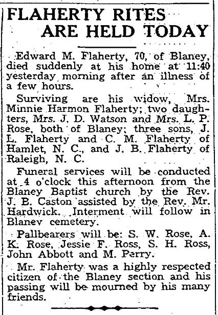 Surviving are his widow, Mrs. Minnie Harmon Flaherty; two daughters, Mrs. J. D. Watson and Mrs. L. P. Rose, both of Blaney; three sons, J. L. Flaherty and C. M. Flaherty of Hamlet, N. C., and J. B. Flaherty of Raleigh, N. C.