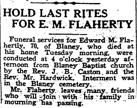 Funeral services for Edward M Flahertly, 70, of Blaney, who died at his home Tuesday morning, were conducted at 4 o’clock yesterday afternoon from Blaney Baptist church by the Rev. J. B. Caston and the Rev. Mr. Hardwick. Interment was in the Blaney cemetery.
