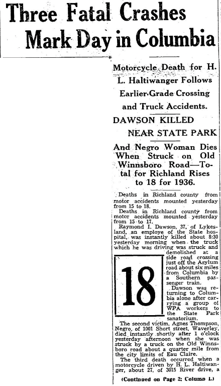 And Negro Woman Dies When Struck on Old Winnsboro Road – Total for Richland Rises to 18 for 1936.