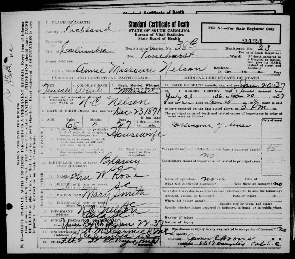 She died on 20 Jan 1937 in Columbia, Richland, South Carolina, USA at Pinehurst. She was buried on 22 Jan 1937 in Elgin, Kershaw, South Carolina, USA at Union Baptist Church Cemetery. Her cause of death was carcinoma of the liver.