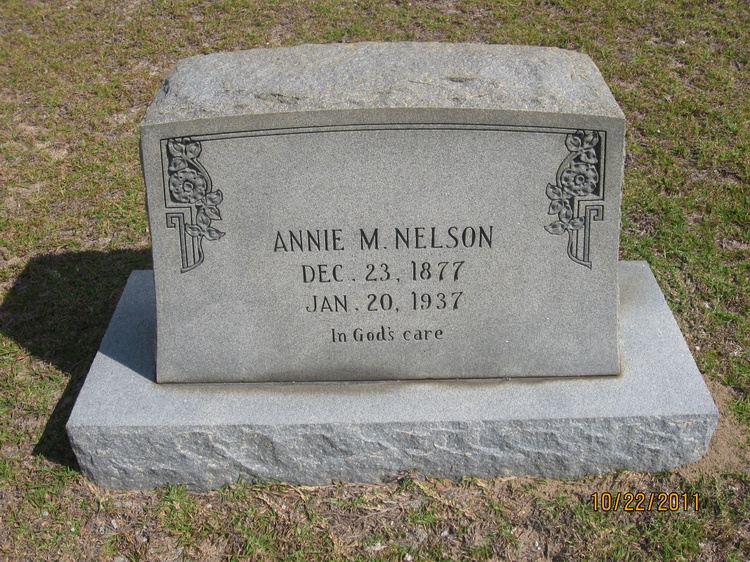 Annie M Nelson was counted in the census on 12 Apr 1930 in Columbia, Richland, South Carolina, USA, as a 58-year-old, female, married, white, wife. Also in the home was her husband, Nathan C. Nelson; and their granddaughter, Beatrice Nelson.