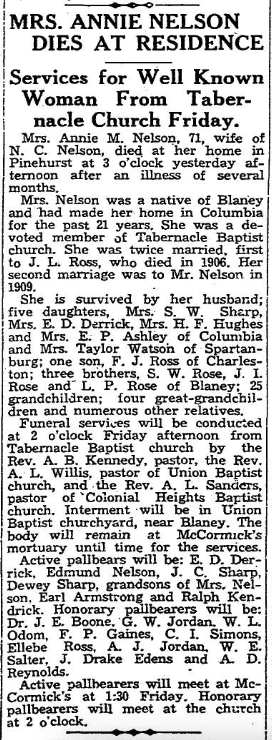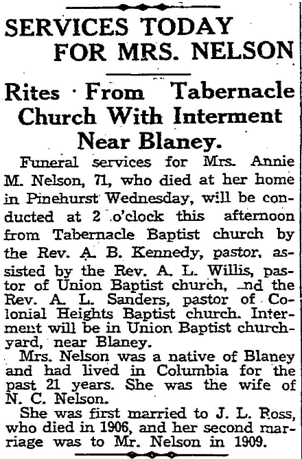 Mrs. Nelson was a native of Blaney and made her home in Columbia for the past 21 years. She was a devoted member of Tabernacle Baptist church. She was twice married, first to J. L. Ross who died in 1906. Her second marriage was to Mr. Nelson in 1909.
