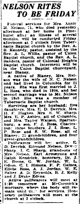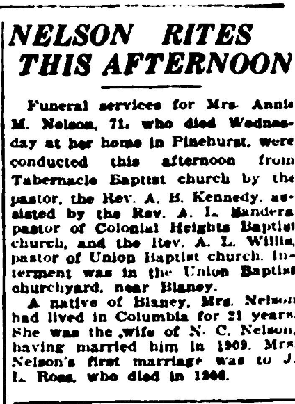 A native of Blaney, Mrs. Nelson was the wife of N. C. Nelson and had lived in Columbia for 21 years. She was first married to J. L. Ross, who died in 1906, and her second marriage to Mr. Nelson in 1909. She was a member of Tabernacle Baptist church.