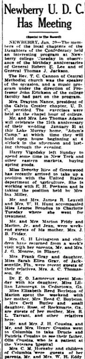 NEWBERRY, Jan. 20 – The members of the local chapters of the Daughters of the Confederacy held an interesting program at Newberry College Tuesday in observance of the birthday anniversaries of General Robert E Lee and the General Thomas J Jackson.