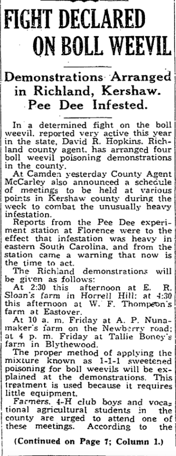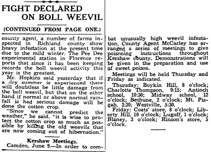 Camden, June 9. – In order to combat unusually high weevil infestation, County Agent McCarley has arranged a series of meetings to give poisoning instructions throughout Kershaw county. Demonstrations will be given in the preparation and use of sweet poison.