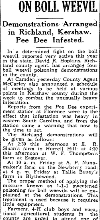 Camden, June 9. – In order to combat unusually high weevil infestation, County Agent McCarley has arranged a series of meetings to give poisoning instructions throughout Kershaw county. Demonstrations will be given in the preparation and use of sweet poison.