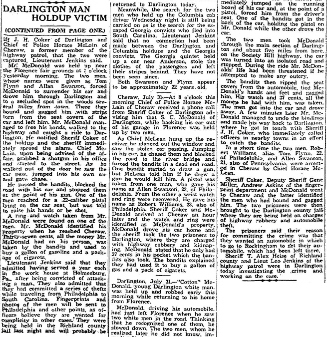 Mr. McDonald was held up near the Florence fair grounds at 7 o’clock yesterday morning. The two men, whose names were given as Tom Flynn and Allan Swanson, Forced McDonald to surrender his car and drove him through Darlington and to a secluded spot in the woods several miles from town. There they bound and gagged him with strips torn from the seat covers of the car and left him. Mr. McDonald managed to free his bonds, walked to the highway and caught a ride to Darlington. He notified Sheriff Coker of the holdup and the sheriff immediately spread the alarm. Chief McLain, upon being advised of the affair, grabbed a shotgun in his office and started to the street. As he walked out of the door he saw the car pass, jumped into his own car and gave chase.