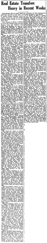 F. T. Dantzler, to T. H. Moffatt, lot east side Garner’s Ferry road, $5; Isabella Distanner to O. B. Jeffcoast and Miss Annie Lou Jeffcoat, 21 1/2 acres in Center Township, $54.74; R. F. DesChamps, to Helen Gulledge, 47.6 acres in school district No. 10, $5 etc; Harry M. Lightsey, Master, vs. Percy Lee Cox et al, to Mary Lina Fellers, 511 and 507 Lady street, $100; C. H. Dixon as reciever National Loan and Exchange bank of Columibia, to Columbia Lumber and Manufacturing company, quit claim to three lots in Eau Claire, $540.