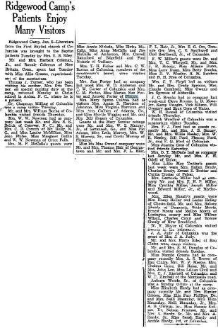 Ridgewood Camp, Jan. 8 – Literature from The First Baptist Church of Columbia was brought to the Baptist patients Tuesday by Mrs. E. B. Baptist.
