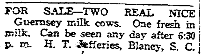 For Sale – Two Real Nice Guernsey milk cows. One fresh in milk. Can be seen any day after 6:30 p.m. H. T. Jefferies, Blaney, S. C.