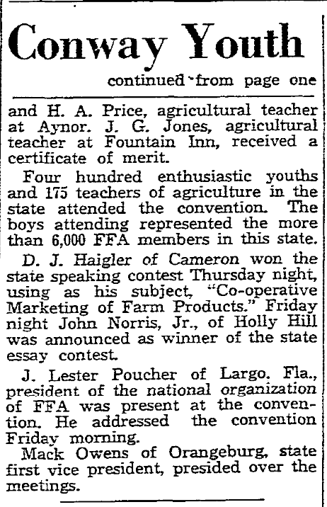 Edwin Collins of Conway was elected president of the state organization of Future Farmers of America for the ensuing year yesterday morning at Drayton hall at the University of South Carolina. Twenty-two boys were awarded the coveted “State Farmer” charms, the highest honor attainable in the state FFA.
