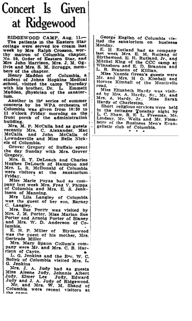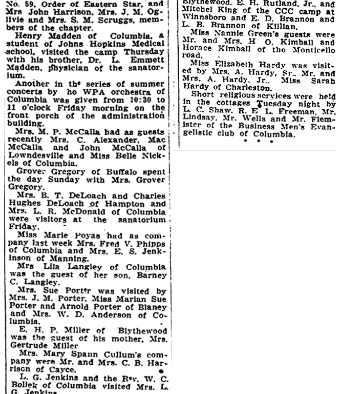 Mrs. B. T. DeLoach and Charles Hughes DeLoach of Hampton and Mrs. L. R. McDonald of Columbia were visitors at the sanatorium Friday.