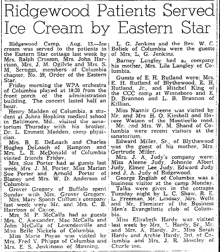 RIDGEWOOD CAMP. AUG. 13 – Ice cream was served to the patients in the Eastern Star cottage last week by Mrs. Ralph Crosson, Mrs. John Harrison, Mrs. J. M Ogilvie and Mrs. S. M. Scruggs, members of Columbia chapter, No. 59, Order of the Eastern Star.