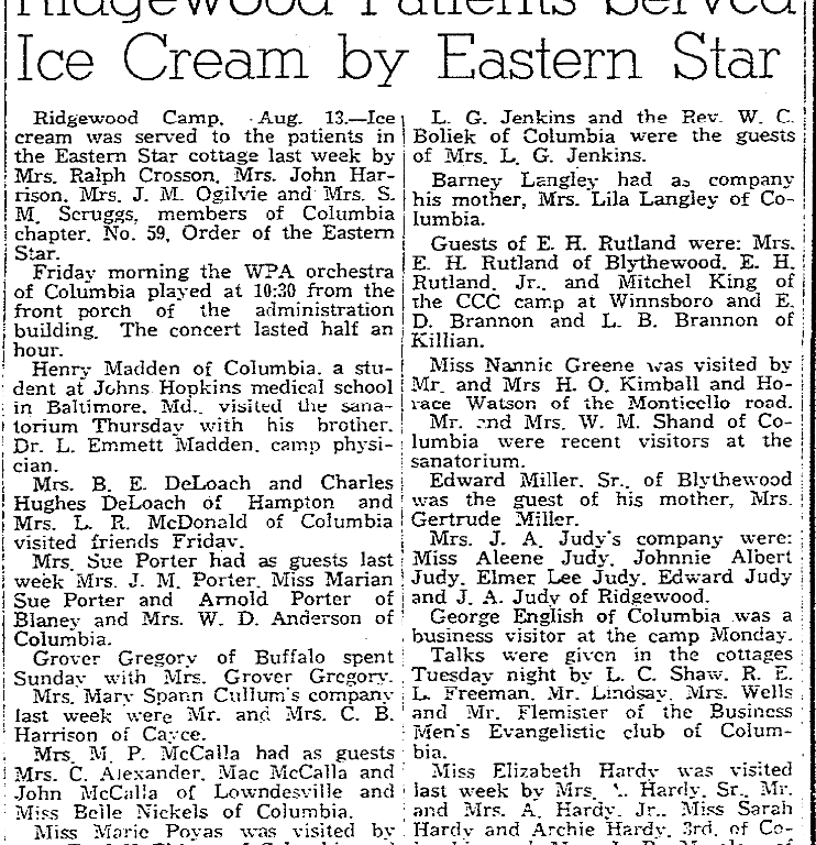 RIDGEWOOD CAMP. AUG. 13 – Ice cream was served to the patients in the Eastern Star cottage last week by Mrs. Ralph Crosson, Mrs. John Harrison, Mrs. J. M Ogilvie and Mrs. S. M. Scruggs, members of Columbia chapter, No. 59, Order of the Eastern Star.