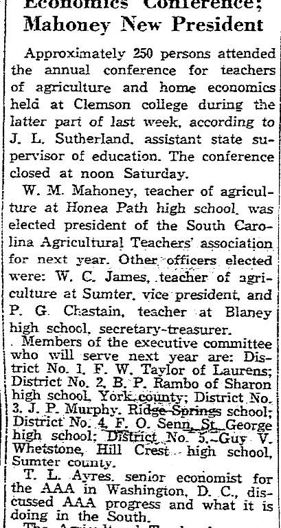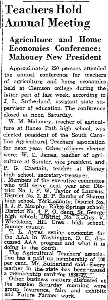 W. M. Mahoney, teacher of agriculture at Honea Path high school was elected president of the South Carolina Agricultural Teachers’ association for next year. Other officers elected were: W. C. James, teacher of agriculture at Sumter, vice president, and P. G. Chastain, teacher at Blaney high school, secretary-treasure.