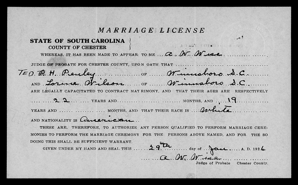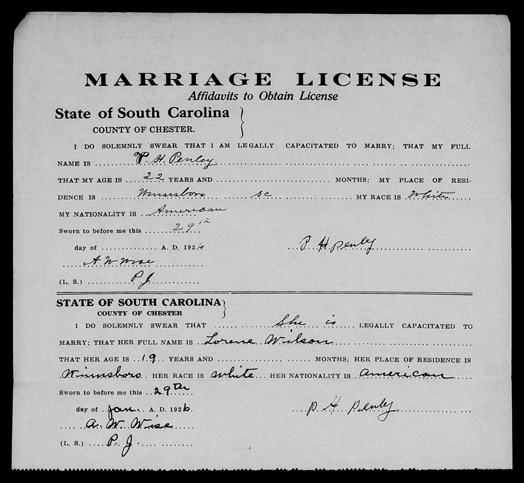 When she was 16, she married T H Penley on 29 Jan 1926 in Chester, South Carolina, USA.