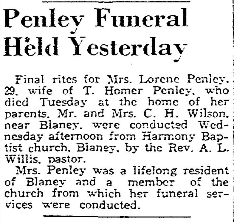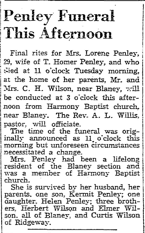 Final rites for Mrs. Lorene Penley, 29, wife of T. Homer Penley, and who died at 11 o’clock Tuesday morning, at the home of her parents, Mr. and Mrs. C. H. Wilson (Cora Bessie Abbott Wilson), near Blaney, will be conducted at 3 o’clock this afternoon from Harmony Baptist church, near Blaney. The Rev. A. L. Willis, pastor, will officiate.