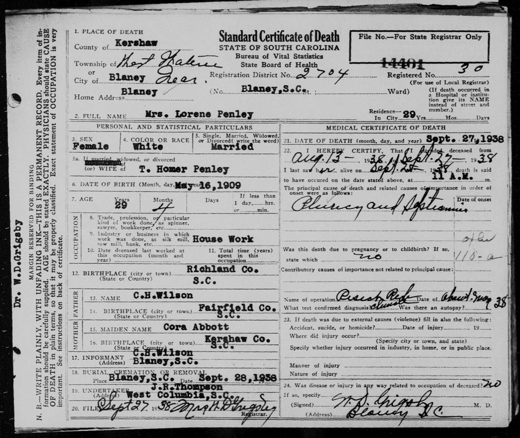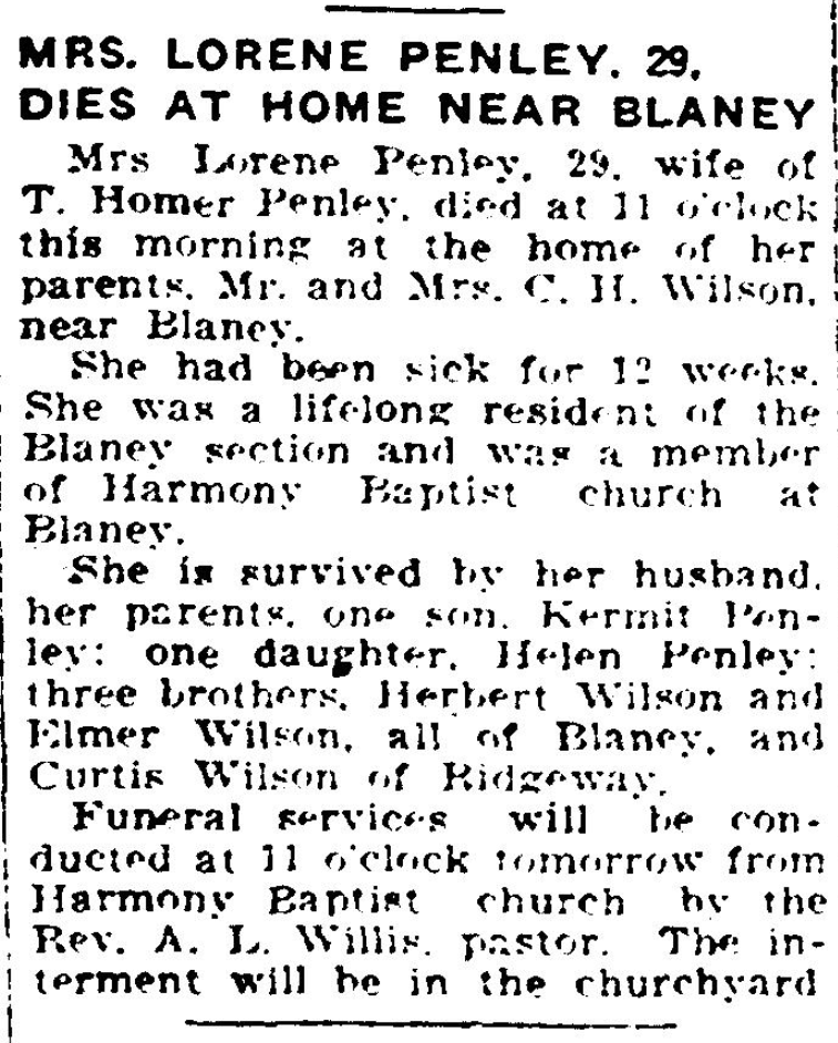 Mrs. Lorene Penley, 29, wife of T. Homer Penley, died at 11 o’clock this morning at the home of her parents, Mr. and Mrs. C. H. Wilson (Cora Bessie Abbott Wilson), near Blaney.