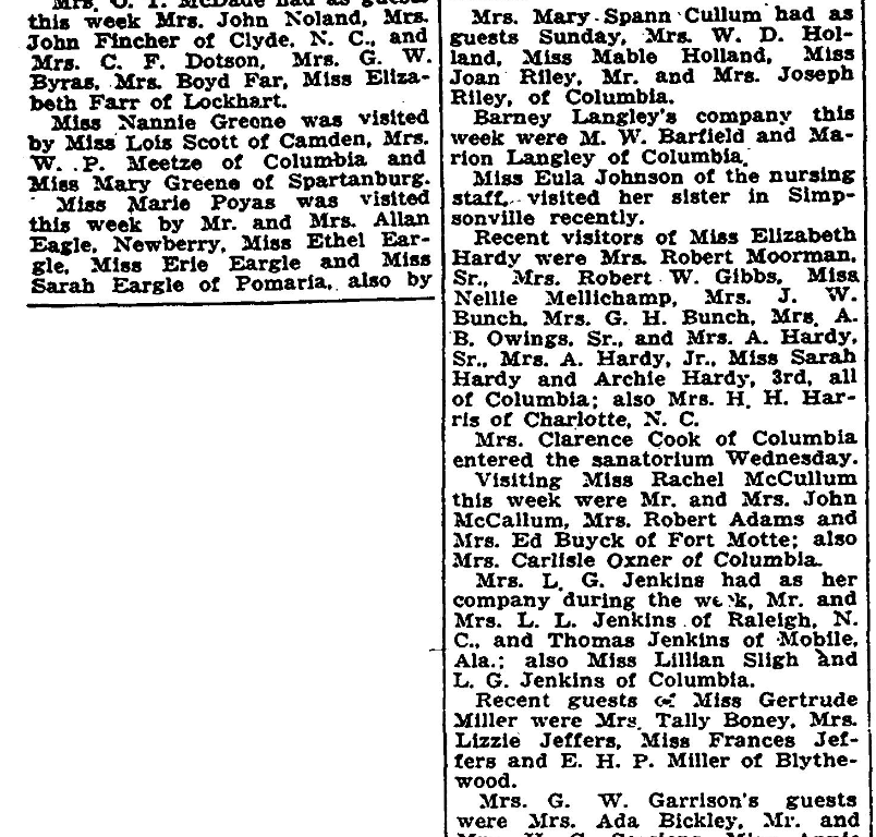 Recent visitors of Miss Elizabeth Hardy were Mrs. Robert Moorman, Sr., Mrs. Robert W. Gibbs, Miss Nellie Mellichamp, Mrs. J. W. Bunch, Mrs. G. H. Bunch, Mrs. A. B. Owings, Sr., and Mrs. A. Hardy, Sr., Mrs. A. Hardy, Jr., Miss Sarah Hardy and Archie Hardy, 3rd, all of Columbia; also Mrs. H. H. Harris of Charlotte, N. C.