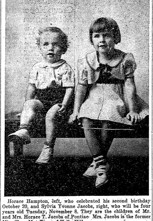 Horace Hampton, left who celebrated his second birthday October 20, and Sylvia Yvonne Jacobs, right, who will be four years old Tuesday, November 8. They are the children of Mr. and Mrs. Horace T. Jacobs of Pontiac. Mrs. Jacobs is the former Miss Clara Mae Kizer of Holly Hill. Continue reading Horace Hampton Jacobs