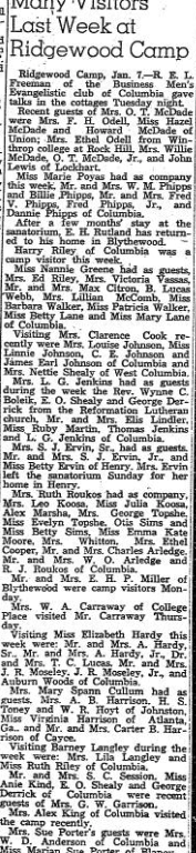 Mrs. Ruth Roukos had as company Mrs. Leo Koosa, Miss Julia Koosa, Alex Marsha, Mrs. George Topshe, Miss Evelyn Topshe, Otis Sims and Miss Betty Sims, Miss Emma Kate Moore, Mrs. Whitton, Mrs. Ethel Cooper, Mr. and Mrs. Charles Arledge, Mr. and Mrs. W. O. Arledge and R. J. Roukos, all of Columbia.