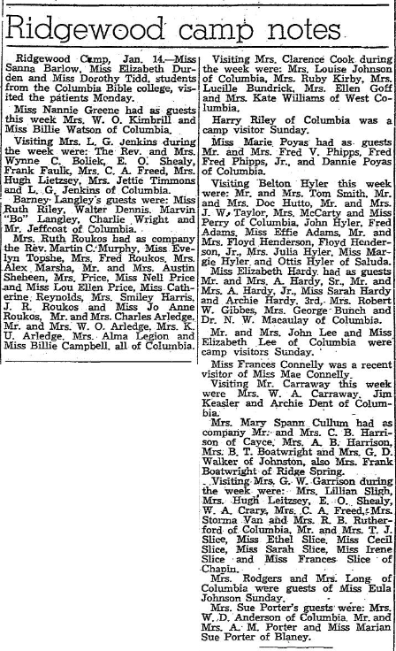 Ridgewood Camp, Jan. 14 – Miss Sanna Barlow, Miss Elizabeth Durden and Miss Dorothy Tidd, students from the Columbia Bible college, visited the patients Monday.