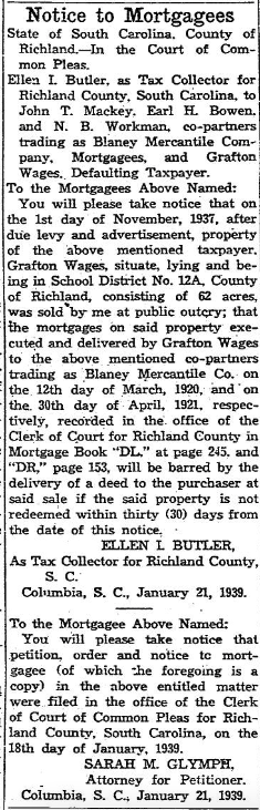 Ellen I Butler, as Tax Collector for Richland County, South Carolina, to John T. Mackey, Earl H. Bowen, and N. B. Workman, co-partners trading as Blaney Mercantile Company, Mortgagees, and Grafton Wages. Defaulting Taxpayer.