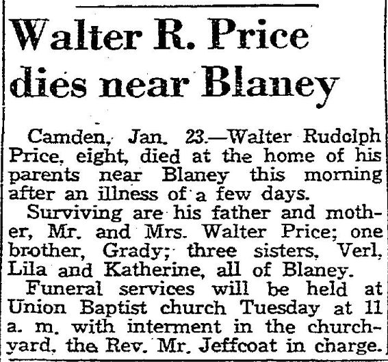 Camden, Jan. 23. – Walter Rudolph Price, eight, died at the home of his parents near Blaney this morning after an illness of a few days.