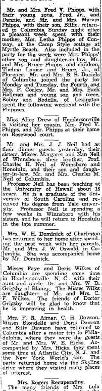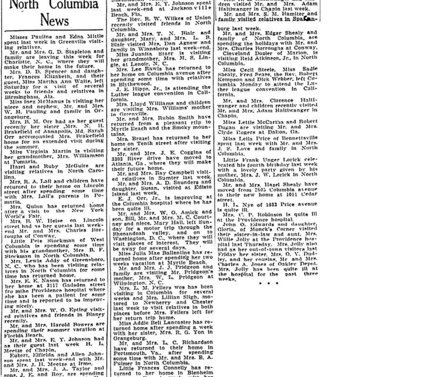 Miss Mattie Roberts has accepted a part time job with Cash Novelty company. Miss Juanita Floyd was a visitor at Bowen’s Friday. Bowen’s welcome the following new students; Katherline Dorsey of Curley and Genie Crooks of Kingstree. Miss Dot Wise enjoyed a visit to Orangeburg last Monday while a guest of her mother, Mrs. Mattie Wise of Fort Motte. F. G. Graham of Aynor visited … Continue reading Bowen’s Briefs