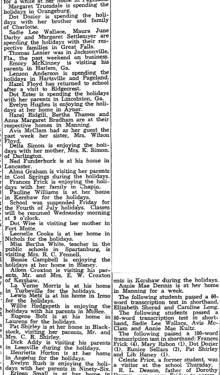 Pat Shirley is at her home in Blackstock, visiting her parents, Mr. and Mrs. C. R. Shirley.