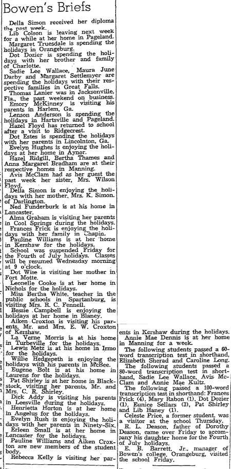 E. B. Barrett, Jr., manager of Bowen’s college. Orangeburg, visited the school. Friday.