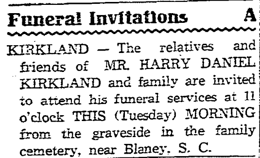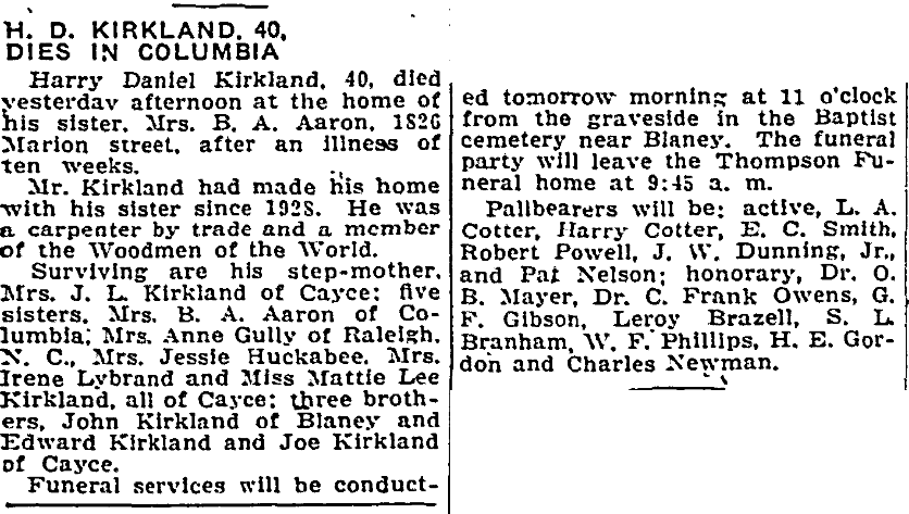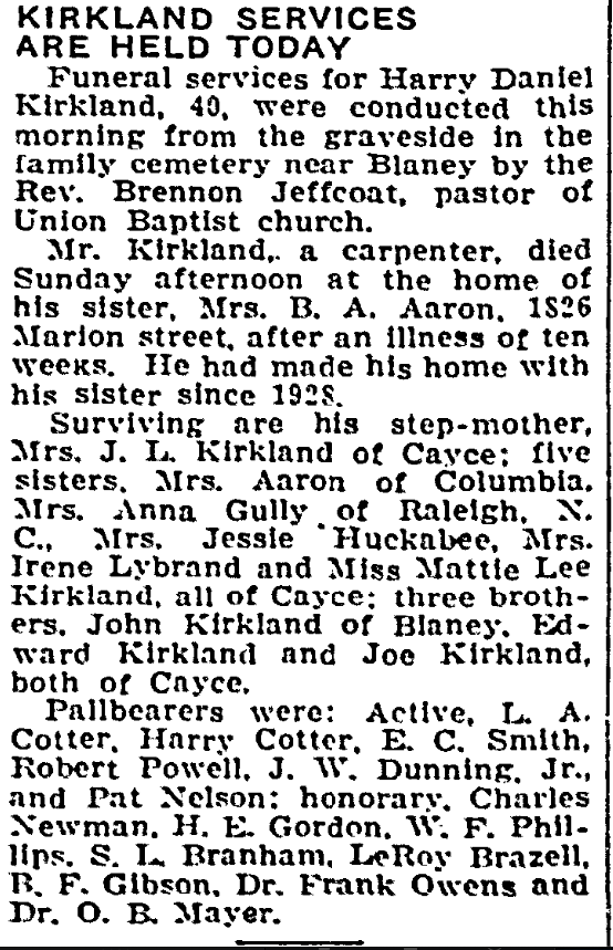 Surviving are his step-mother, Mrs. J. L. Kirkland of Cayce; five sisters, Mrs. B. A. Aaron of Columbia; Mrs. Anne Gully of Raleigh, N. C., Mrs. Jessie Huckabee, Mrs. Irene Lybrand and Miss Mattie Lee Kirkland, all of Cayce; three brothers, John Kirkland of Blaney and Edward Kirkland and Joe Kirkland of Cayce.