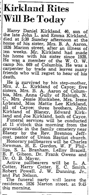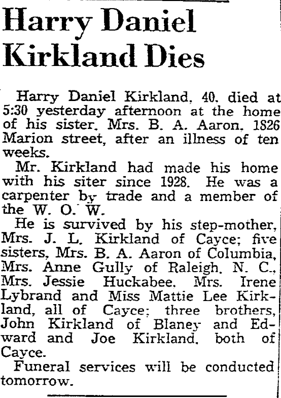 Harry Daniel Kirkland, 40, died yesterday afternoon, August 6, 1939, at the home of his sister, Mrs. B. A. Aaron, 1826 Marion street, after an illness of ten weeks.