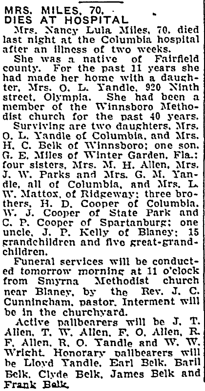 Surviving are two daughters, Mrs. O. L. Yandle of Columbia, and Mrs. H. C. Belk of Winnsboro; one son, G. E. Miles of Winter Garden, Fla.: four sisters, Mrs. M. H. Allen, Mrs. J. W. Parks and Mrs. G. M. Yandle, all of Columbia, and Mrs. L. W. Mattox of Ridgeway; three brothers, H. D. Cooper of Columbia, W. J. Cooper of State Park and C. P. Cooper of Spartanburg; one uncle, J. P. Kelly of Blaney; 15 grandchildren and five great-grandchildren.