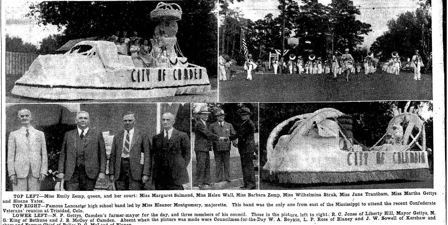 LOWER LEFT – N. P. Gettys, Camden’s farmer-mayor for the day, and three members of his council. Those in the picture, left to right: R. C. Jones of Liberty Hill, Mayor Gettys, M. G. King of Bethune and J. B. McCoy of Camden. Absent when the picture was made were made were Councilmen-for-the-Day W. A. Boykin, L. P. Rose of Blaney and J. W. Sowell of Kershaw and farmer Chief of Police D. G. McLeod of Blaney.