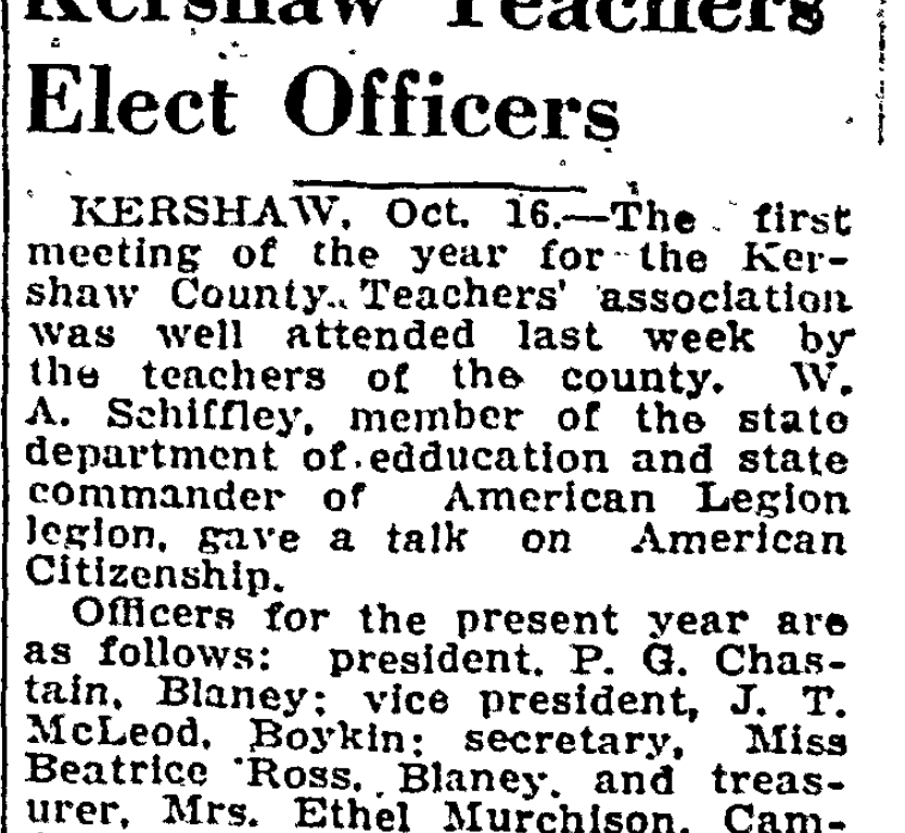 KERSHAW, October 16 – The first meeting of the year for the Kershaw Teacher’s association Thursday, October 12 was well attended by the teachers of the county. W. A. Schiffley, member of the state department of education and state commander of the American Legion gave a most worthwhile talk on “American Citizenship.”