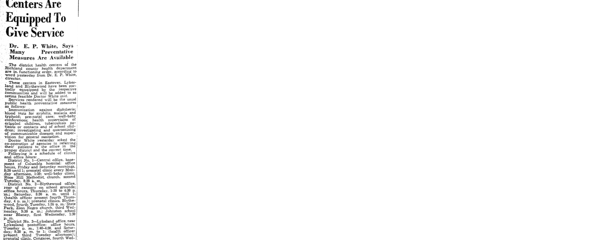 District No. 2 – Blythewood office, rear of cannery on school ground; office hours, Thursday, 1:30 to 4:30 p.m.; Saturday, 8:30 a.m. until 1; (health officer present fourth Thursday, 4 p.m.); prenatal clinics, Blythewood, fourth Tuesday, 1:30 p.m. State Park, Zion Negro church, third Wednesday, 9:30 a.m.; Johnston school near Blaney, first Wednesday, 1:30 p.m.