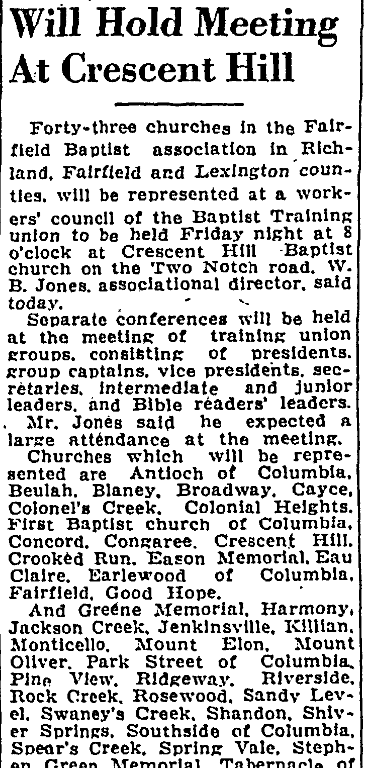 Churches which will be represented are Antioch of Columbia, Beulah, Blaney, Broadway, Cayce, Colonel’s Creek, Colonial Heights, First Baptist church of Columbia, Concord, Congaree, Crescent Hill, Crooked Run, Eason Memorial, Eau Claire, Earlewood of Columbia, Fairfield, Good Hope.