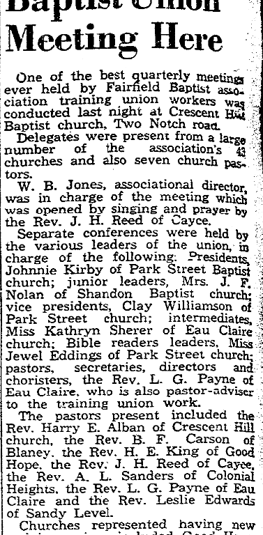 The pastors present included the Rev. Harry E. Alban of Crescent Hill church, the Rev. B. F. Carson of Blaney, the Rev. H W. King of Good Hope, the Rev. J. H. Reed of Cayce, the Rev. A. L. Sanders of Colonial Heights, the Rev. L. G. Payne of Eau Claire and the Rev. Leslie Edwards of Sandy Level.