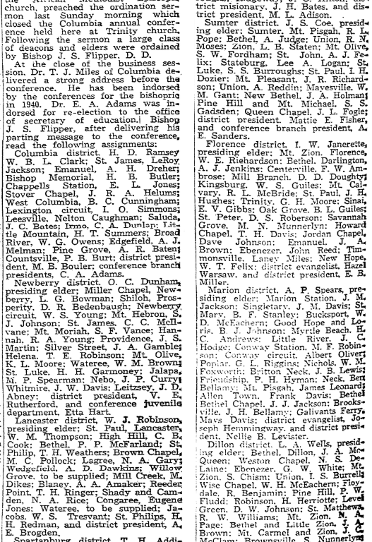 Florence district, I. W. Janerette, presiding elder: Mt. Zion. FLorence, W. E. Richardson: Bethel, Darlington, A. J. Jenkins: Centerville; F., W. Ambrose: Mill Branch, D. D. Doughty; Kingsburg. W. S. Guiles; Mt. Calvary, R. L. McBride; St. Paul, J. H. Hughes: Trinity, G. H. Moore; Sinai, E. V. Gibbs; Oak Grove, B. L. Guiles; St. Peter, D. S. Roberson; Savannah Grove, M. N. Munnerlyn; Howard Chapel, T. H. Davis; Jordan Chapel, Dave Johnson; Emanuel, J. A. Brown; Ebenezer, John Reed; Timmonsville, Laney Miles; New Hope, W. T. Felix; district evangelist, Hazel Warsaw, and district president, E. B. Miller.