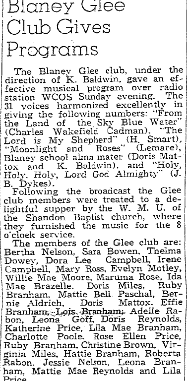 The Blaney Glee club, under the direction of K. Baldwin, gave am effective musical program over radio WCOS Sunday evening. The 31 voices harmonized excellently in giving the following numbers: “In the Land of the Sky-blue water” (Charles Wakefield Cadman), “The Lord Is My Shepherd” (H. Smart), “Moonlight and Roses,” (Lemare), Blaney school alma mater (Doris Mattox and K. Baldwin), and “Holy, Holy, Holy, Lord God Almighty” (J. B. Dykes).