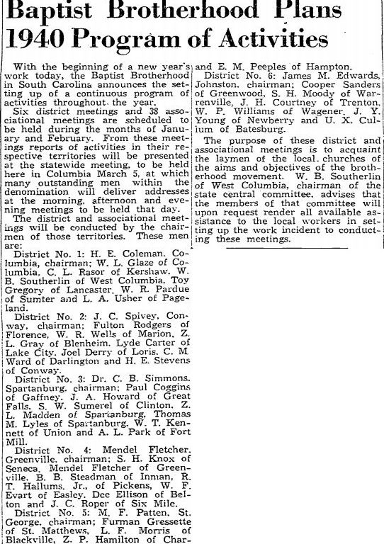 The purpose of these district and associational meetings is to acquaint the laymen of the local churches of the aims and objective of the brotherhood movement. W. B. Southerlin of West Columbia, Chairman of the state central committee, advises that the member of that committee will upon request render all available assistance to the local workers in setting up the work incident to conduct these meetings.