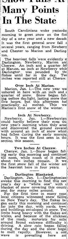 The heaviest falls were evidently at Darlington, Newberry, Marion and Cheraw. An inch and a quarter fell at Marion, and inch and a quarter fell at Marion, an inch at Newberry while Darlington was pounded by the flakes until far in the day. Two inches was reported still at Cheraw.